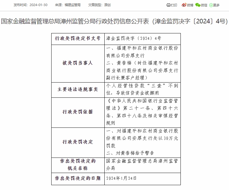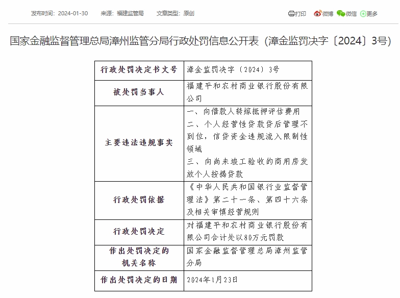 具体来看,福建平和农村商业银行股份有限公司因向借款人转嫁抵押评估费用;个人经营性贷款贷后管理不到位,信贷资金违规流入限制性领域;向尚未竣工验收的商用房发放个人按揭贷款,被国家金融监督管理总局漳州监管分局合计处以80万元罚款,作出处罚决定的日期为2024年1月23日。福建平和农村商业银行股份有限公司安厚支行因个人经营性贷款“三查”不到位,导致信贷资金被挪用,被国家金融监督管理总局漳州监管分局处以30万元罚款,作出处罚决定的日期为2024年1月24日。