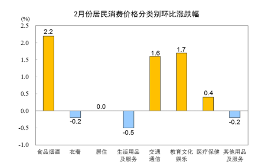 3月9日,国家统计局发布数据显示,2月份,全国居民消费价格指数(CPI)同比上涨0.7%,环比上涨1.0%,同比回升较多,反映了春节期间消费需求增加等因素的影响。