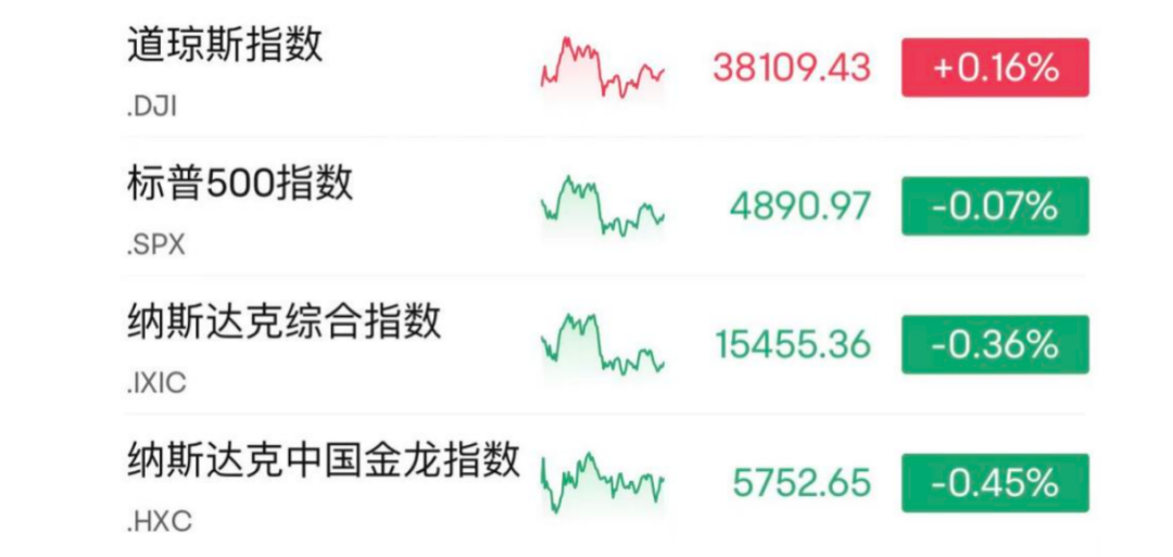 当地时间1月26日,美股三大股指涨跌不一,道指再创历史新高,标普500指数、纳指双双结束日线六连涨。截至收盘,道指报38109.43点,涨幅为0.16%;标普500指数报4890.97点,跌幅为0.07%;纳指报15455.36点,跌幅为0.36%。