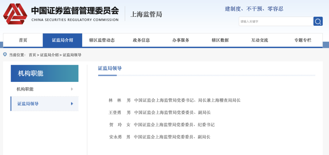 1月11日,上海证监局官网更新的信息显示,该局党委书记、局长兼上海稽查局局长为林林。